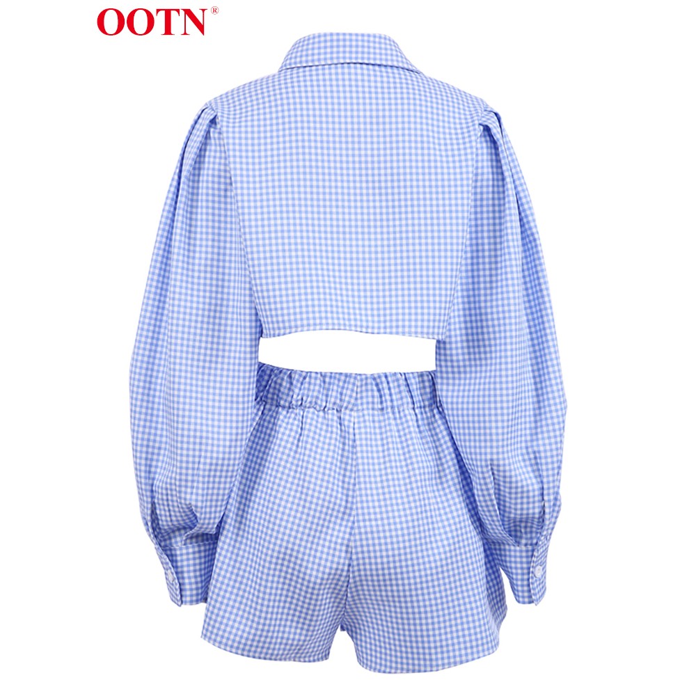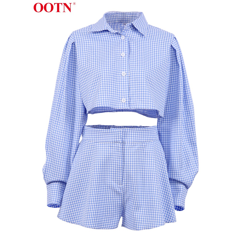 OOTN Gingham Long Lantern Sleeve Turn-Down Collar Shirt Single Breasted Crop Top Suits With Shorts High Waist Summer 2 Piece Set