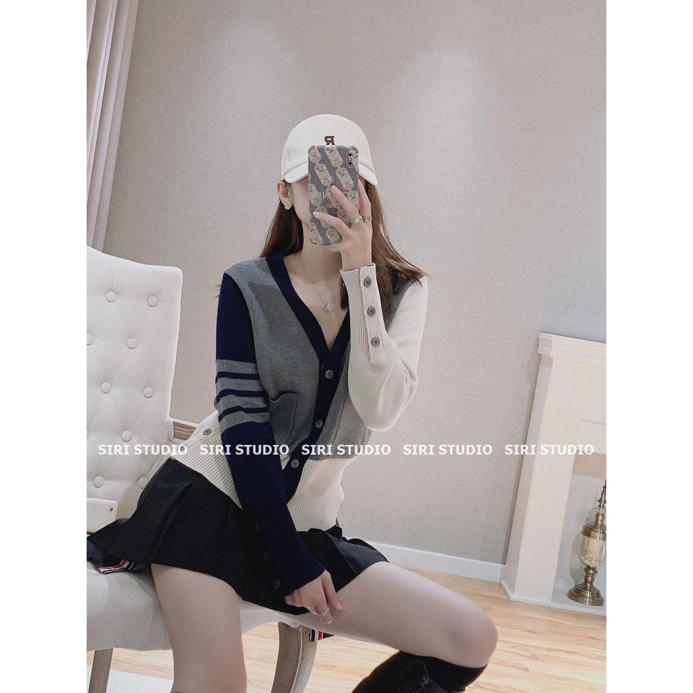 TB knitted cardigan sweater with women's spring and autumn college style four-bar retro lazy V-neck color-blocking top coat